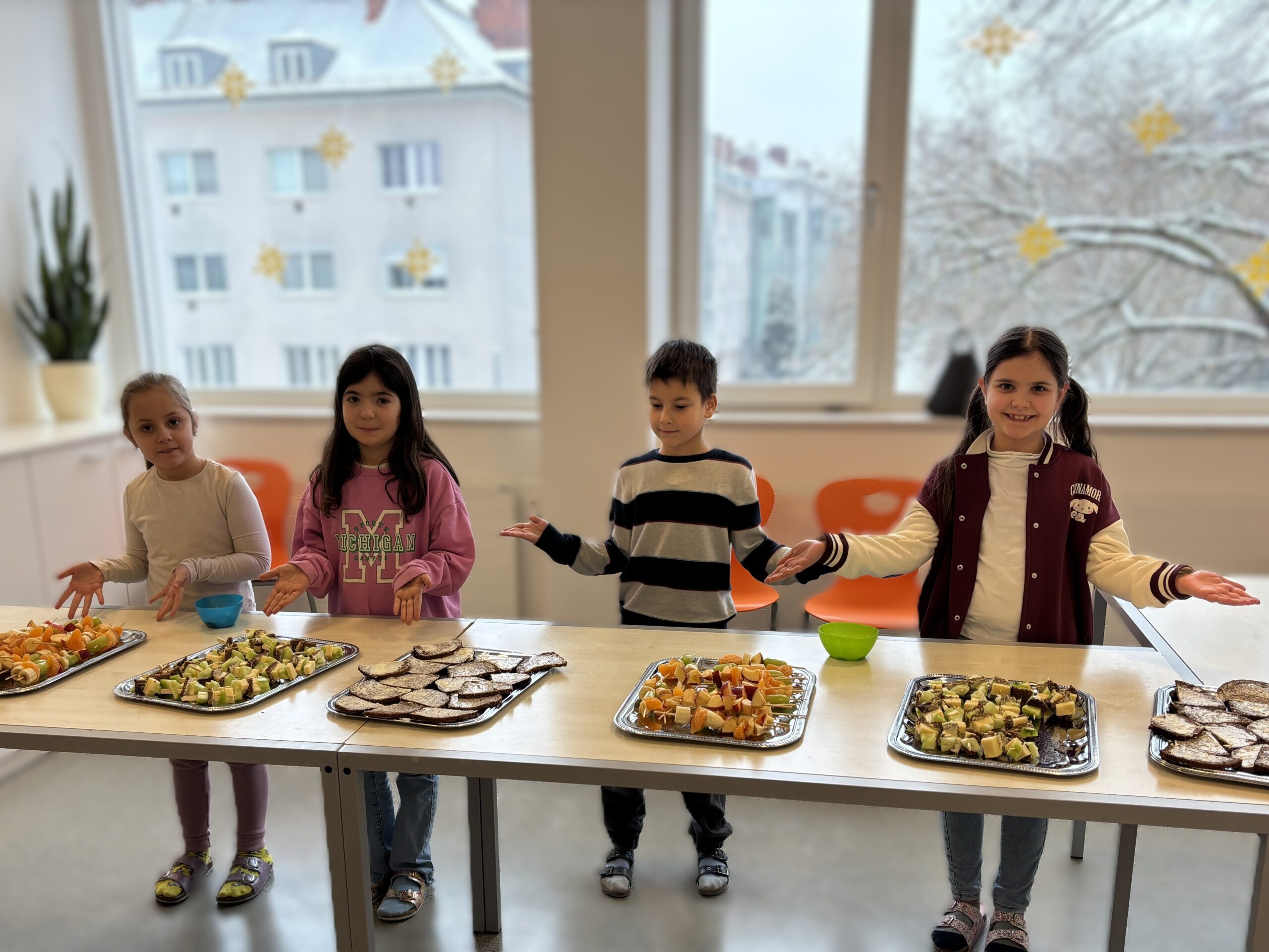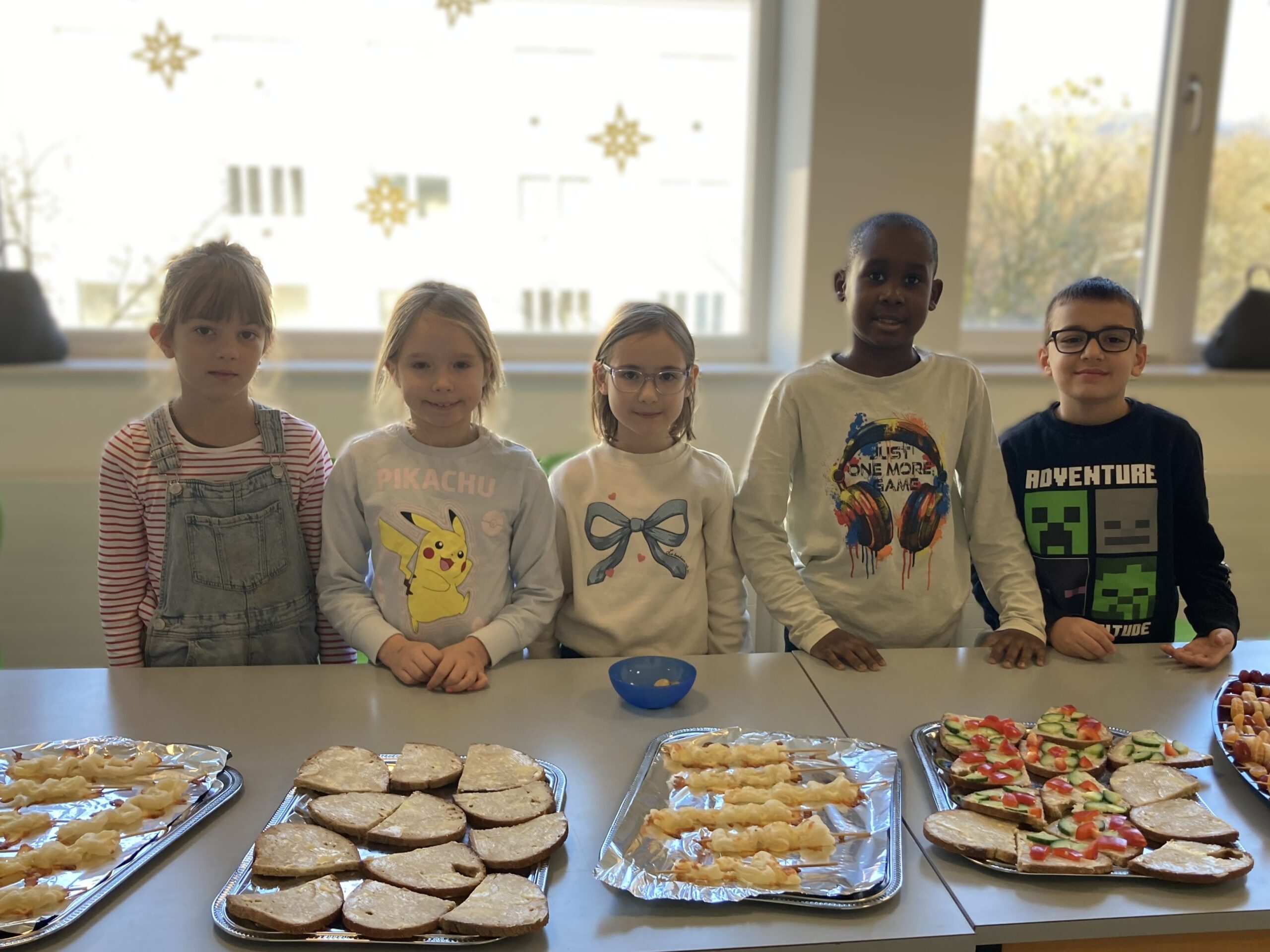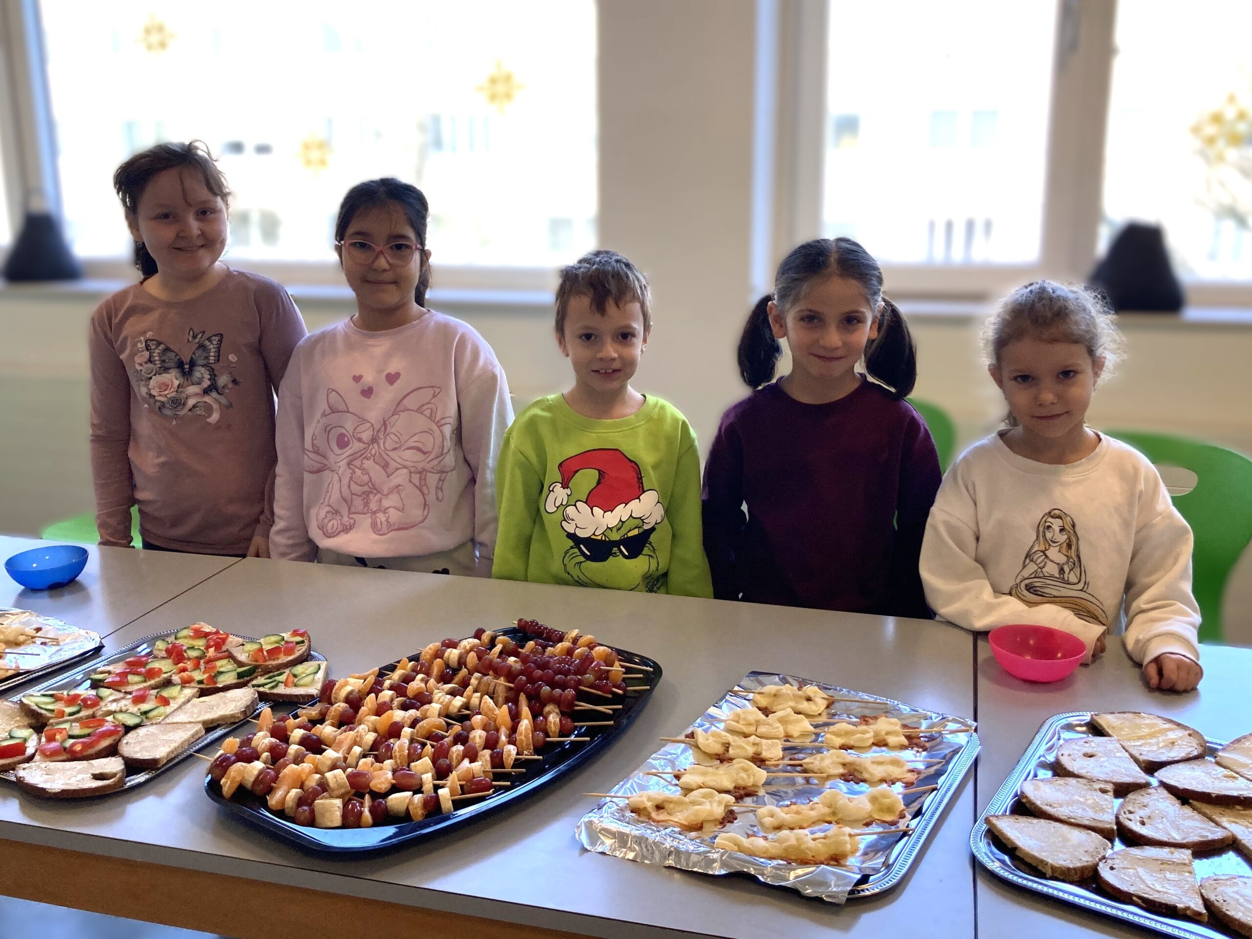 Die Kinder der 1a und 1b bereiten jeweils eine gemeinsame Jause für alle Robinsons vor.